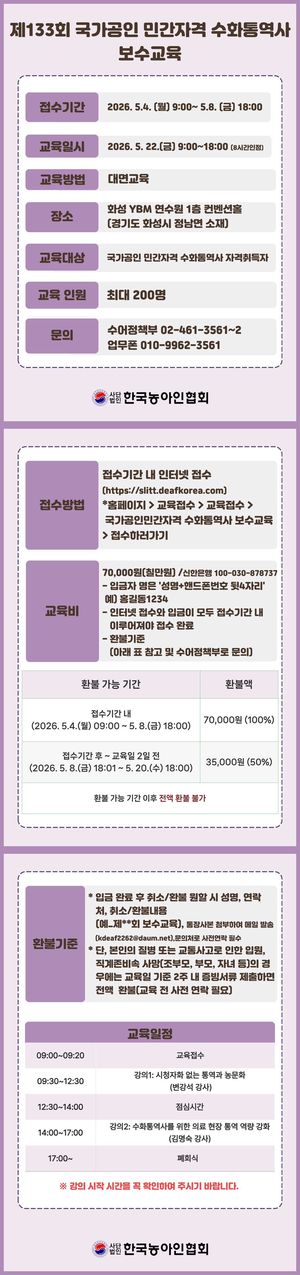 제133회 국가공인 민간자격 수화통역사 보수교육 참가 안내
